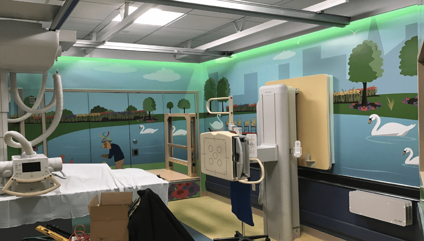 Medical imaging, testing and monitoring equipment can be intimidating and overwhelming for children. Rethink the appearance of scary machines with environmental graphics. Create a sense of place for young patients and their families that ties into the overall visual environment with colors, characters and scenes designed to put them at ease. We’ll work with you to choose the correct medium for your space.