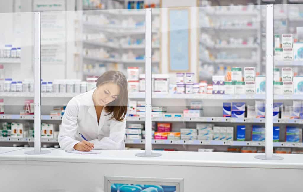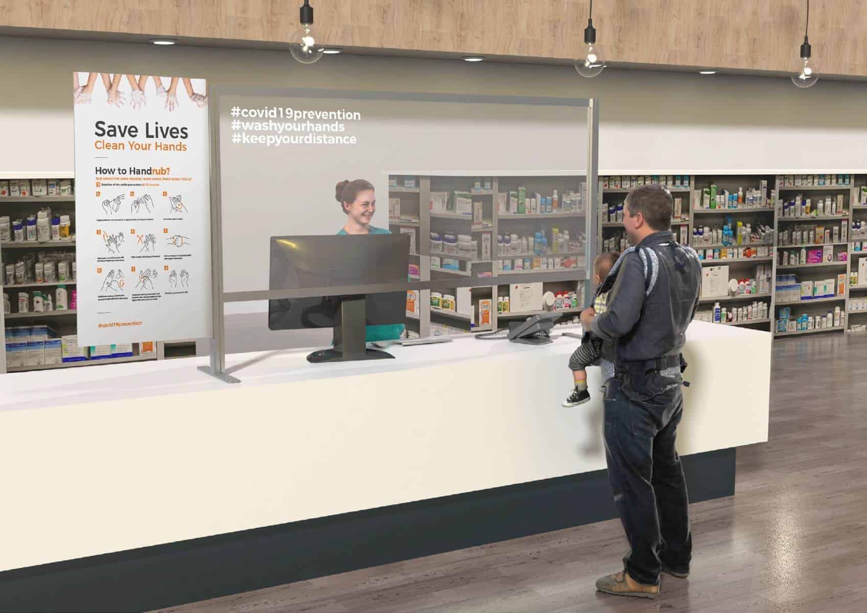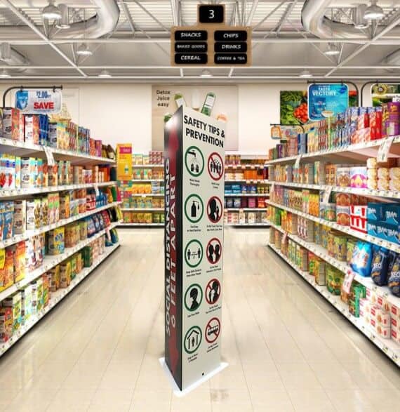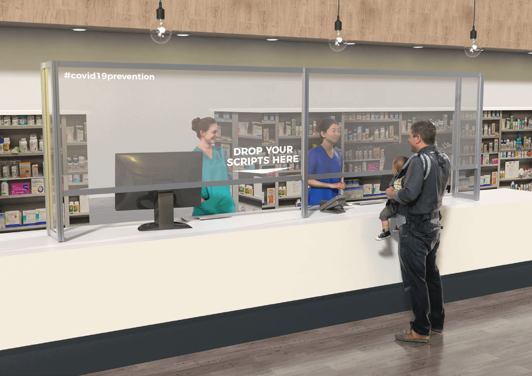 Part of staying open is keeping your team healthy. Front-line employees in banking, healthcare, pharmacy, grocery and convenience chains face the threat of illness every day. Temporary structures to enforce social distancing are a good way to provide added space and protection. Floor decals can help illustrate proper social distancing rules. Our “people protection barriers” offer a lightweight, transparent solution to protect those key employees.