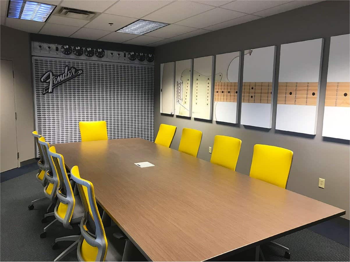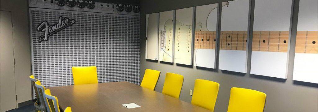 Add your company logo, a relaxing design or go with a theme like we did with our Fender conference room!