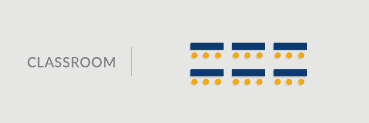 All attendees face the front of the room, so this meeting room setup idea is perfect for lectures or presentations, both in-person and via video conference. The classroom can accommodate small-to-mid-sized groups, depending on the space, but doesn’t lend itself to group work and personal interaction. If your classroom focuses on a single screen for presentations, a chevron variation might best suit your needs.