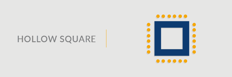 If the traditional boardroom appeals to your aesthetic or suits an existing space — but if you’re looking for a meeting room design that can more easily accommodate a live presenter or more attendees — the hollow square might be a good fit. This setup is a good choice for easy and efficient group communication. It also gives a moderator or facilitator the option of working from the center of the space. Hollows squares aren’t necessarily the most efficient choice, if space is a premium, and they lack the intimacy of setups like banquet, reception or even boardroom styles.