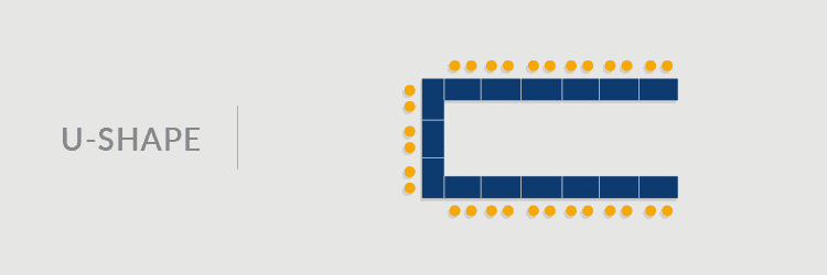 This layout, also known as theater style, is similar to a classroom-style setup but is often aimed at larger groups. Do you often host all-hands or town hall meetings? Do you need extra space for your team to spread out? This design will help get as many people as possible into one space. Auditorium and theatre style meeting room setups are ideal for presentations, both in-person and via video conference/webinar. These styles aren’t ideal for conversation and cooperation.
